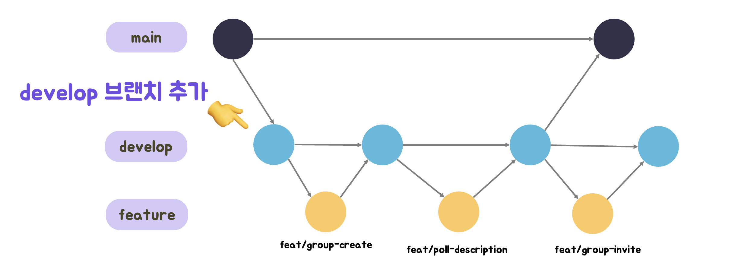 2. feature branch에서 기능 개발을 마치면 develop branch로 머지한다.