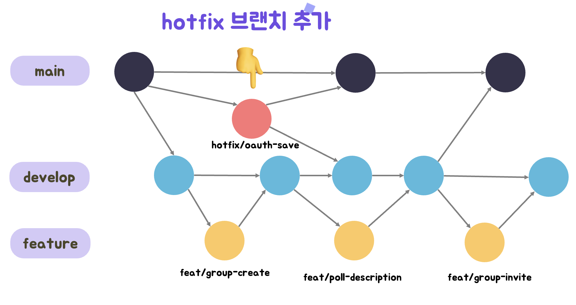 develop branch에서 검증을 진행하고 main branch에 머지를 하였지만, main branch에서 예상치 못한 오류가 발생했던 상황들이 있었다. 이런 오류 해결은 기능 개발이 아니고, 빠르게 수정해서 main에 반영해야 했으므로 develop branch에서 진행하지 않고 hotfix branch에서 진행했다.