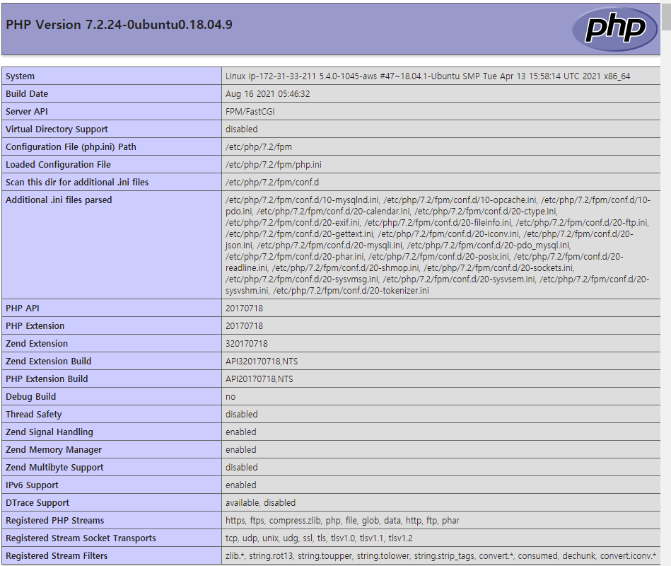 - PHP설치 시, PHP-fpm을 설치하는 이유: apache에는 apache용 php와 연동 되는 모듈이 있어서 자체적으로 처리할 수 있다. nginx에는 php와의 연동 되는 모듈이 없기 때문에 php-fpm를 따로 설치해서 nginx와 연동시켜야 한다.